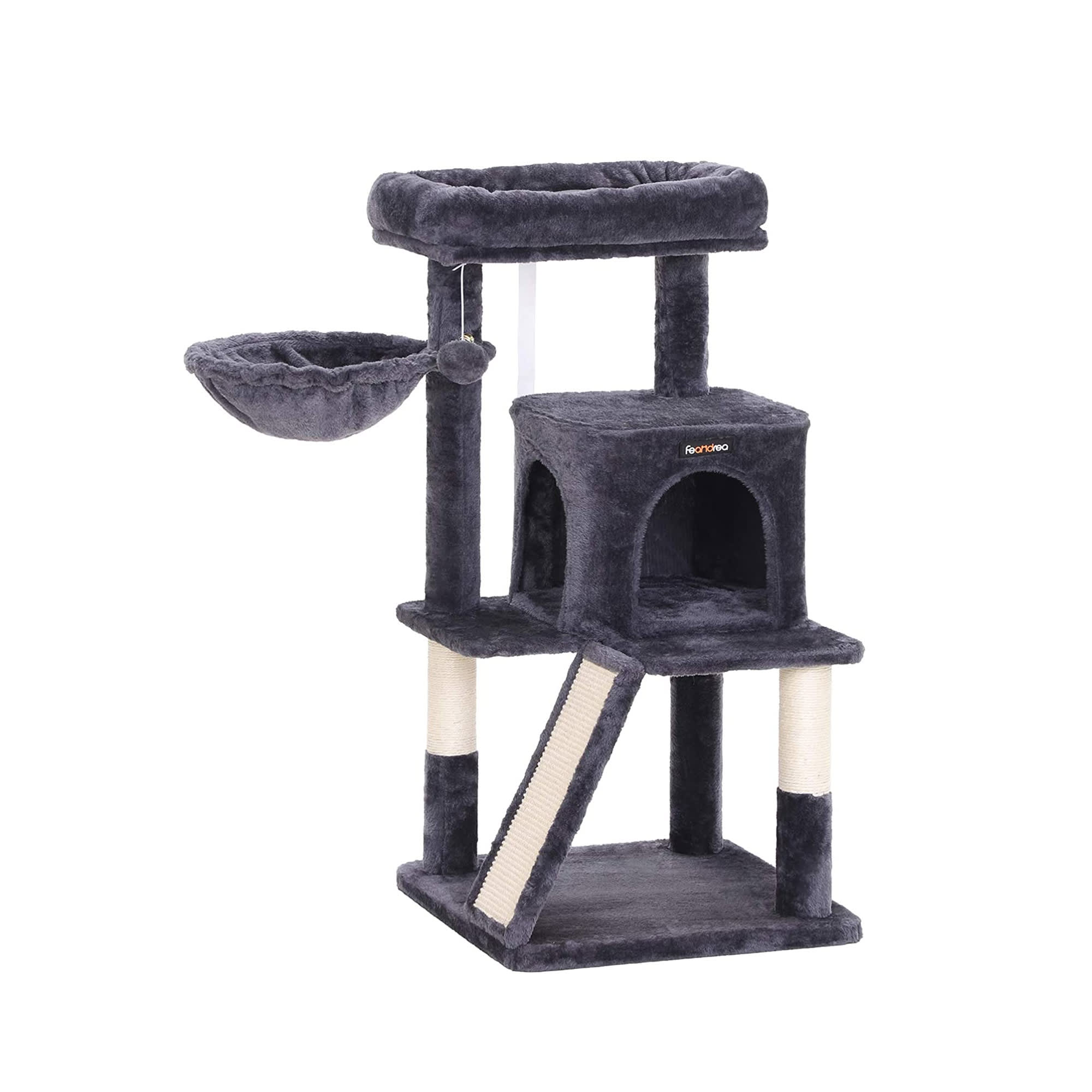 The Rapunzel Cat Tree at a glance: Sturdy cat tree with lots of places to sleep. Also suitable for large-breed cats and multi-cat households. Colour: dark grey or cream. Total dimensions: 60 x 50 x 181 cm (L x W x H) Max. space required with protruding platforms: 70 x 62 x 181 cm (L x W x H) Base: 60 x 50 cm (L x W) 1 large den:Cat Trees & Cat Scratching Posts Cat scratching posts and trees are an ideal play and sleeping place for cats - whether you have a large or a smaller active cat. Cats love to sleep high up on a cat tree and a scratching post is indispensable for your cat's daily claw sharpening and your cat will appreciate a cat play tower to climb on.The zooplus selection of cat trees come in a variety of shapes and sizes. If you do not find the perfect one here, see our full selection of cat trees & cat scratching posts . If you only have limited outdoor space but your cat still likes to climb, you may like an outdoor cat tree .84900.7. £79.99. Carry on saving. Product description. Additional information. Reviews. Product description. A sturdy cat tree with sisal posts, a comfy hammock, large play den, soft paw-shaped bed and a high observation platform with washable, upholstered cushion. Dimensions: 49 x 49 x 163 cm (L x W x H)Cat tree and scratching post in dark grey, with den and two platforms, softly cushioned lounging area, fluffy post with toy mouse in opening. Dimensions: 103.5 x 58 x 38cm (H x L x W) Dimensions: 103.5 x 58 x 38cm (H x L x W)